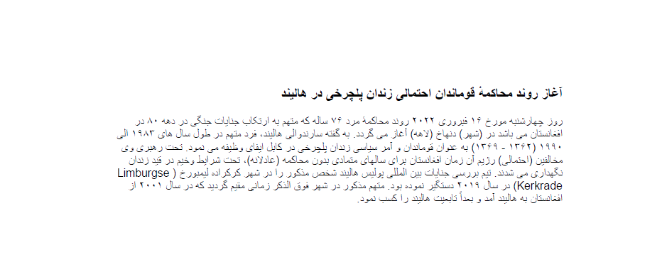 آغاز روند محاکمه قوماندان احتمالی زندان پلچرخی در هالیند