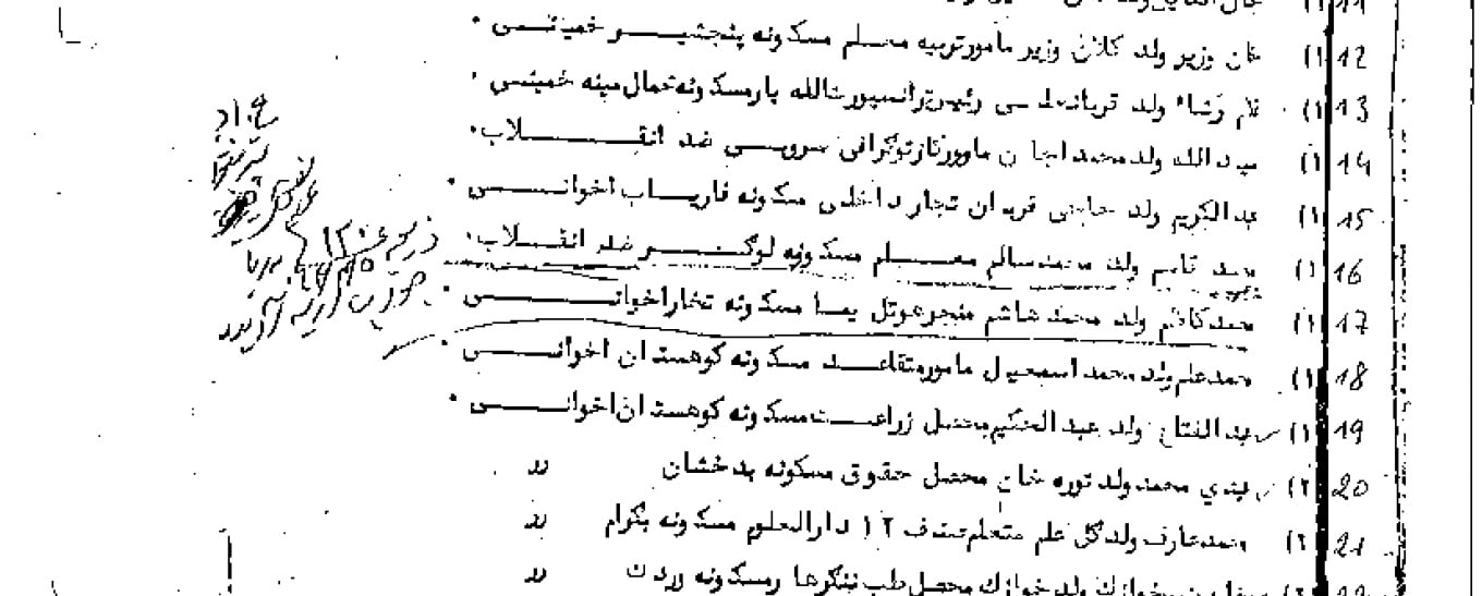 On these pages, the dead are listed in chronological and alphabetic order. The Lists state their names, the names of their fathers, their professions and their places of residence as well as accusations. The woman gave the Lists to the Police on the condition that they would be returned to her. She had obtained the list from United Nations Special Rapporteur for Afghanistan Felix Ermacora.