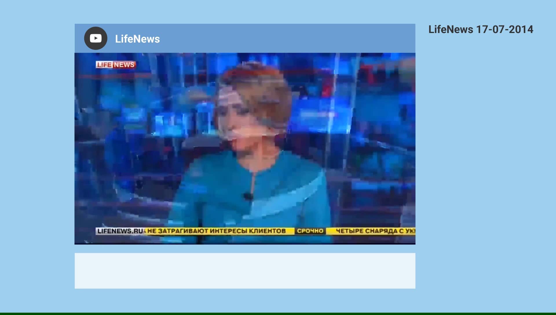 Shortly after the crash of MH17 the same claim was broadcast on television. In the initial hours after the crash multiple pro-Russian television stations reported that armed groups fighting the Ukrainian government claimed to have downed an An-26. A number of channels, including LifeNews and Russia24, also mentioned eyewitnesses who had seen a missile. The following report was broadcast on LifeNews on 17 July starting at 16.34, i.e. within 15 minutes of the crash: