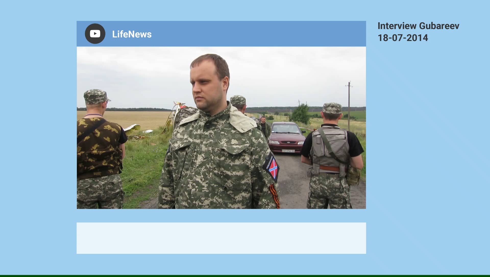 In the days following 17 July 2014 both the DPR and the Russian Federation emphatically pointed the finger at the Ukrainian armed forces. On 18 July 2014 the DPR ‘governor’ of the city of Donetsk, a man named Gubareev, gave an interview in which he said that flight MH17 was shot down by a Ukrainian anti-aircraft system with the help of radar. In that interview he also said that the rebels did not have a Buk or radar.