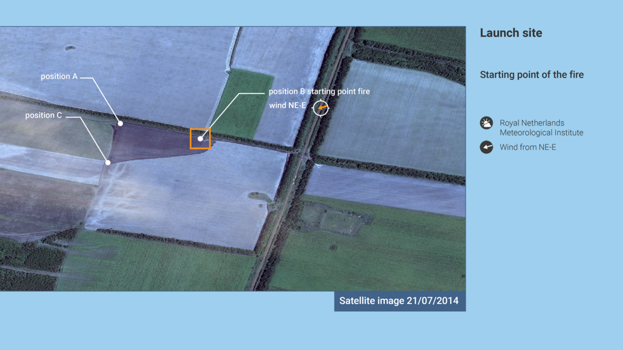The KNMI observed that at 16:20 (UTC+3) on 17 July 2014 there was a northeasterly to easterly wind in the region. If a fire originates in one spot, its seat will move with the wind, which may make the seat wider. This means that a fire burning in a northeasterly to easterly wind could expand in a southwesterly to westerly direction. If the fire started at around 16:20 on 17 July 2014, then of the locations supplied by the police only location B (or somewhere in the vicinity of location B) is a logical point of origin. Location B is the place where, according to X48, the missile was launched.