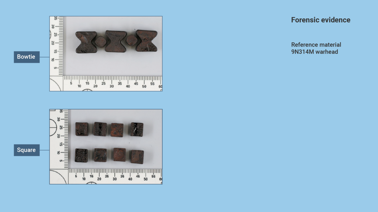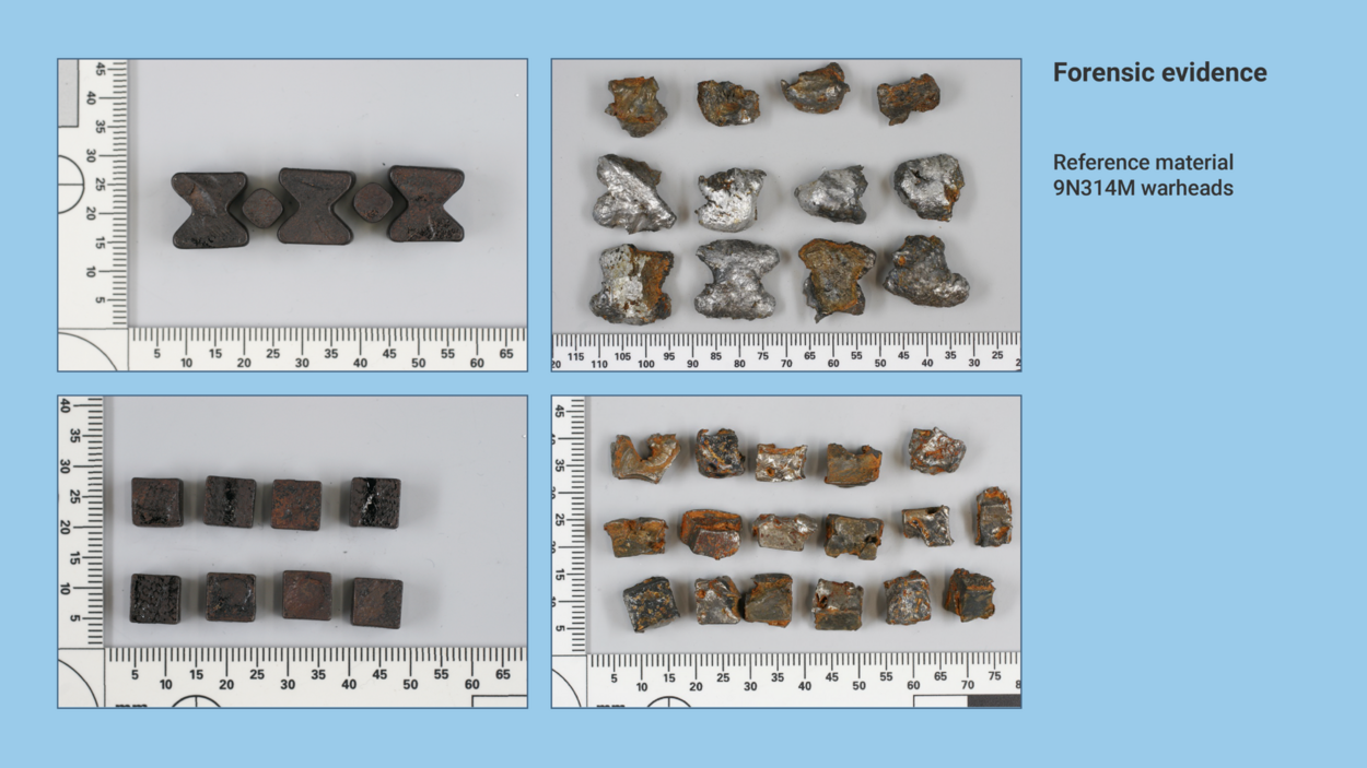 The NFI selected a number of these for further investigation. These fragments were then compared with fragments from six 9N314M warheads, including fragments secured after the arena tests in Ukraine and Finland. A total of 195 fragments were examined.