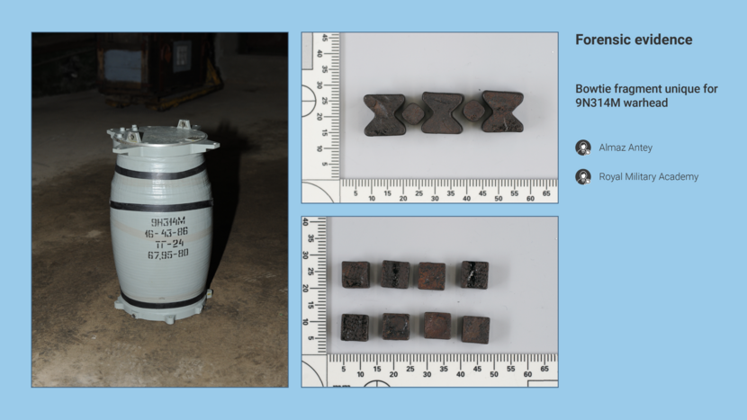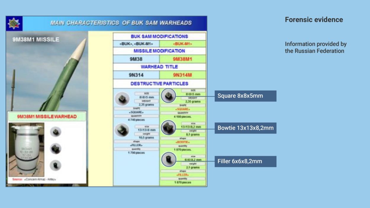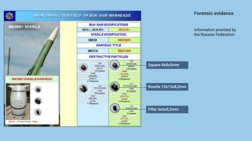 According to Almaz-Antey, the shapes and dimensions of the fragments are specific to each type of warhead. The bowtie, for example, is only found in the 9N314M warhead. According to the RMA’s expert, too, the bowtie fragments are unique to the 9N314M warhead of a Buk missile.