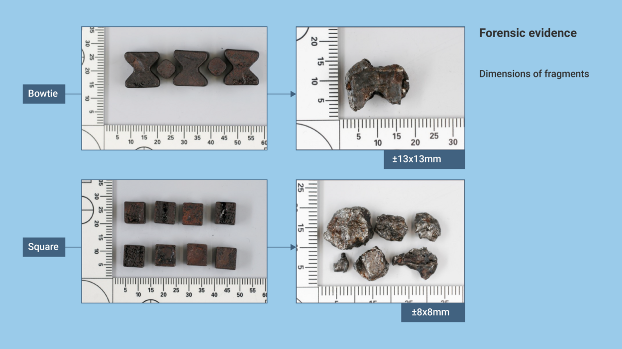The Russian Federation and Almaz Antey provided information on the shape and dimensions of the fragments from the 9N314M warhead: the dimension of the bowtie is 13X13X8,2 mm, the dimension of the square is 8X8X5 mm and the dimension of the filler is 6X6X8,2 mm. These dimensions are virtually the same as those of the fragments secured after the dismantling of a 9N314M warhead in Ukraine, as established by the JIT. The forensic photos with the ruler we have just exhibited show that the bowtie and tile fragments found at the crash site have the same dimensions as the same-shaped fragments from the 9N314M warhead of a Buk missile. They also resemble the bowties and tiles secured after the arena tests in Finland and Ukraine.