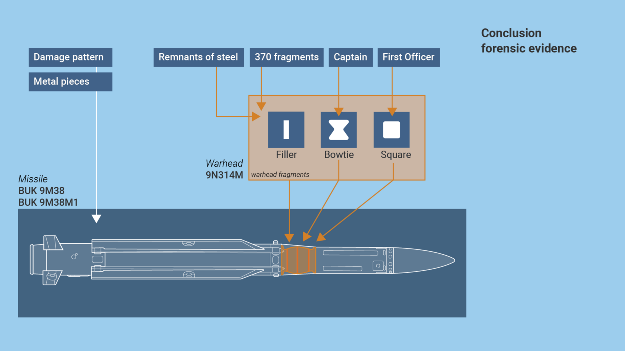Research by the NFI concluded that most of the dents and perforations were the result of impacts by steel objects. A Buk missile warhead contains pre-formed steel fragments. Further research showed that the elemental composition of the steel fragments found in the dents and perforations was consistent with that of the pre-formed fragments from a Buk missile warhead.