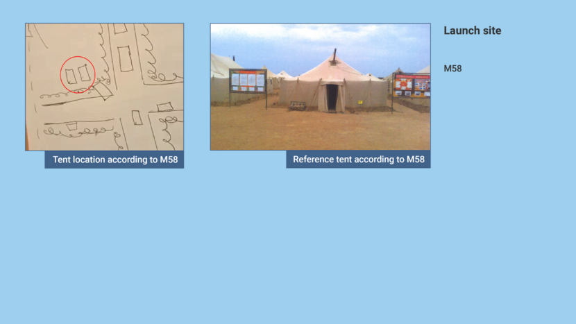 On 9 February 2019 M58 sent the investigation team a photo of a similar tent with the comment: ‘We had two tents like this at the checkpoint!’ The tent in question was a circular, light-coloured army tent. In exactly the same location as where M58 had drawn two tents, the satellite photos of 20 and 21 July 2014 show two white, circular spots which were not visible on the image of 16 July 2014. Although the presence of tents says nothing about whether or not a missile was launched, this finding is relevant to the assessment of the reliability of M58’s statement.