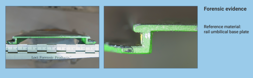 A foreign object in the form of a piece of stainless steel was found in part of the aircraft’s metal frame on the left side of the cockpit (AAGK3338NL). A twisted piece of dark green metal was found in the groove of the frame of the left cockpit window (AAHZ3650NL). Both objects were embedded in the aircraft wreckage. In the case file they are also referred to as the ‘lump’ (from the aircraft’s frame) and the ‘green lump’ (from the window frame groove). The NFI removed these objects from the wreckage. The lump from the frame was then sawn into three pieces. All parts were subsequently examined by the NFI and by forensic specialists from the Australian Federal Police (AFP). We will first discuss the NFI investigation.
