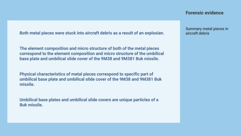 The NFI determined the elemental composition and microstructure of these fragments. Both consisted of hot-rolled martensitic stainless steel. The NFI also determined the elemental composition and microstructure of various parts from several reference Buk missiles, such as the umbilical base plate and umbilical slide cover. These slide covers and base plates are located on a contact point in the tail section of a Buk missile to which the cable of the Buk launch vehicle is connected. On the basis of their elemental composition and microstructure, the object from the aircraft’s frame and the object from the cockpit window frame groove cannot be distinguished from material in the slide covers and umbilical base plates of the 9M38 reference missiles and one of the two 9M38M1 reference missiles. In other words, according to the NFI these objects must have been produced using the same material as the slide covers and umbilical base plates of these reference missiles. These are either from the same stainless steel plate or from multiple plates that are identical on the basis of their composition. In these types of investigations the NFI often uses a number of hypotheses. The results of the investigation are then used to determine the probability or improbability of a particular hypothesis. In this case, according to the NFI the findings are much more likely (i.e. much more explicable) if these fragments came from the slide cover and umbilical base plate of a Buk missile than if they came from a different source, such as another weapon.