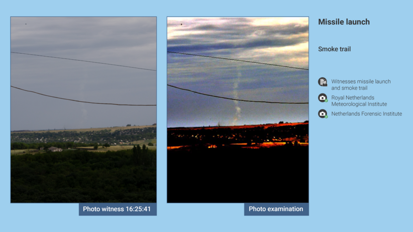 In addition, the KNMI examined the image of the white smoke trail on one of the two photos. Since the trail is clearly vertically oriented and is thickest at the horizon, the KNMI ruled out the possibility that the trail originated from an aircraft at high altitude. The KNMI further concluded that the cloud pattern on the photo was consistent with the cloud visible on satellite images on the afternoon of 17 July 2014.
